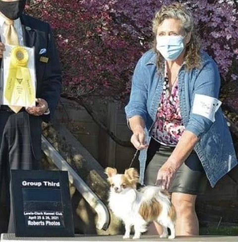 SUNNI, 5 lb daughter of AKC Grand Champion "Stuffin" and AKC CH "Flutter". Sunni and Ivy are full sisters. DOB 5/19/23. Loving and a great mother! Sunni has all three OFA clearances, CHIC certification and genetic testing. Both her parents have had genetic testing too.