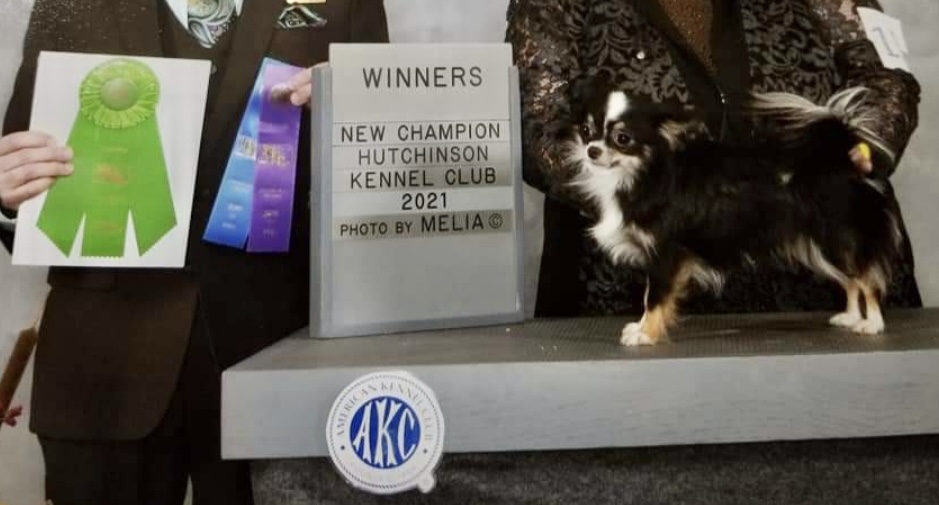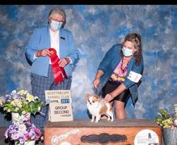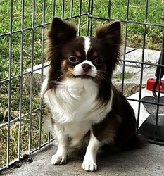 SUNNI, 5 lb daughter of AKC Grand Champion "Stuffin" and AKC CH "Flutter". Same info and pedigree as Ivy! DOB 5/19/23. Loving but wary with strangers. Sunni has all three OFA clearances.