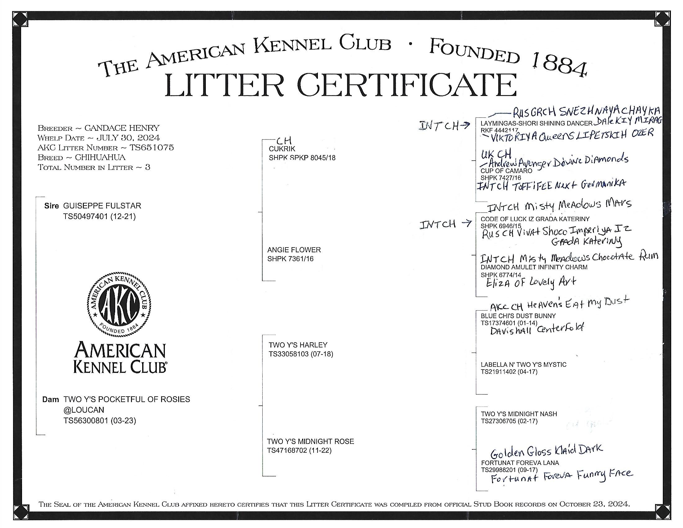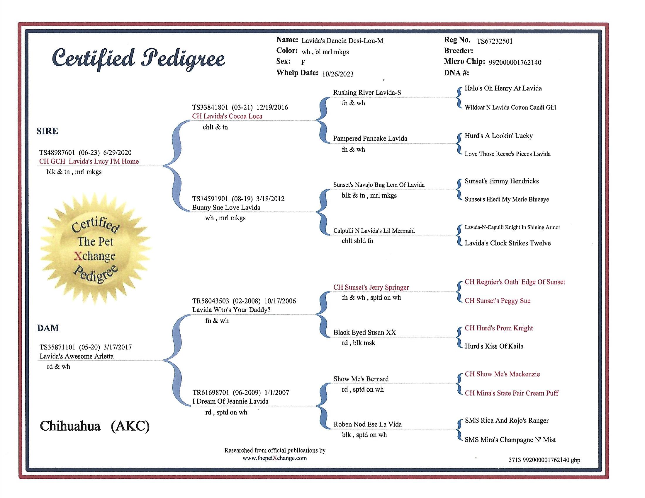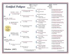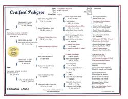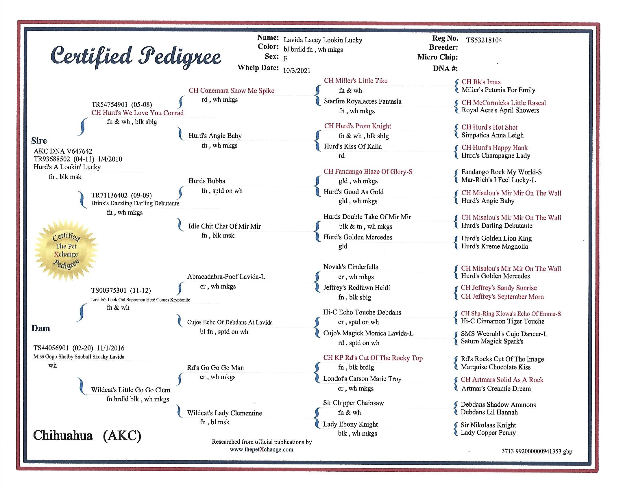 PEDIGREE LORELEI, BLUE, Litter pedigree doesn't show champions so I filled those in from researching pedigree databases.